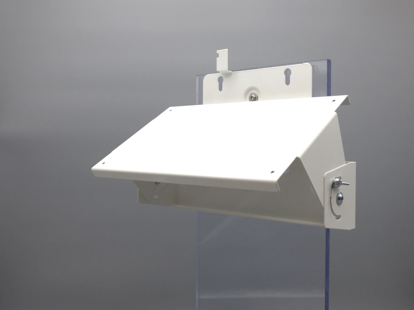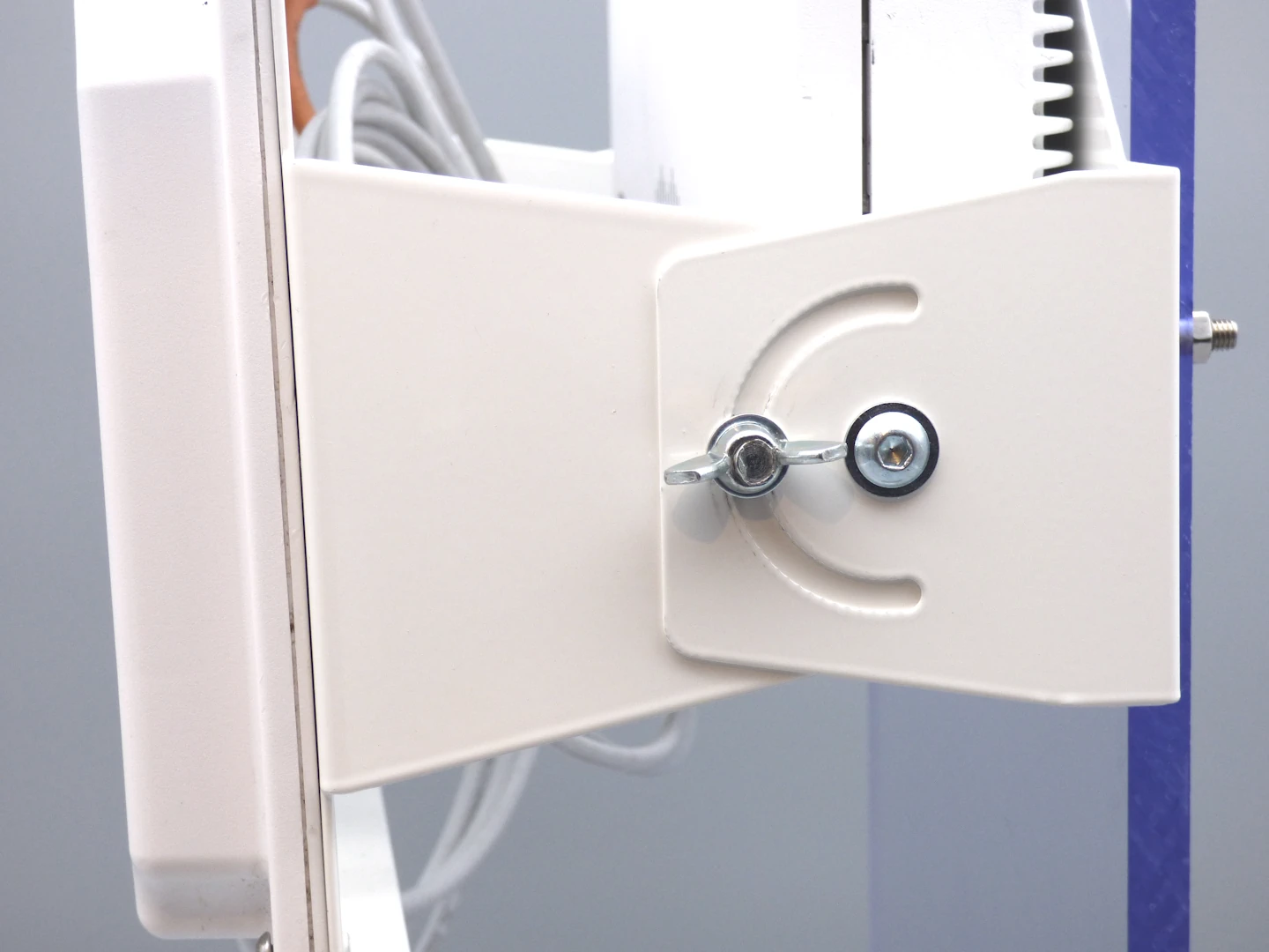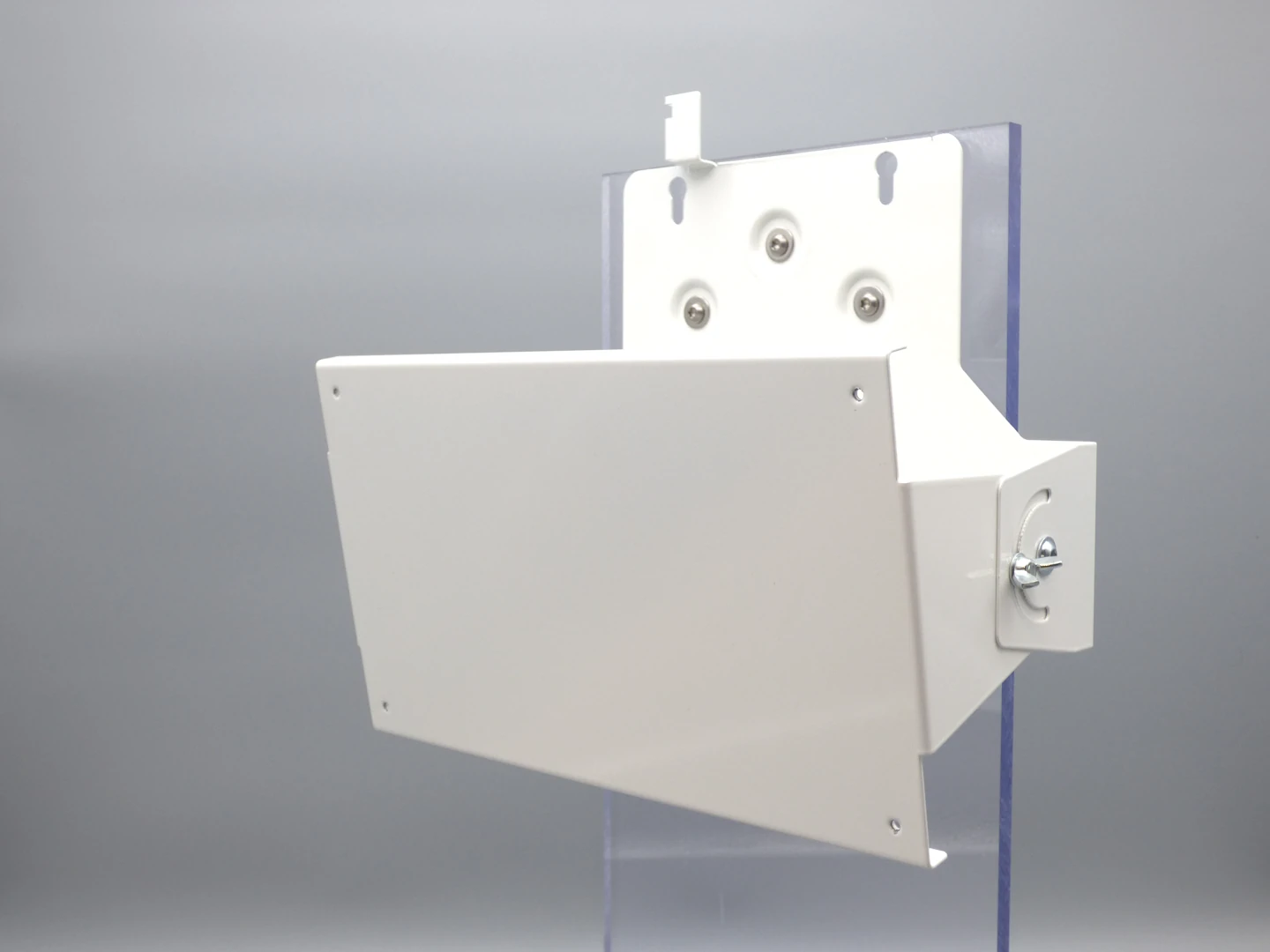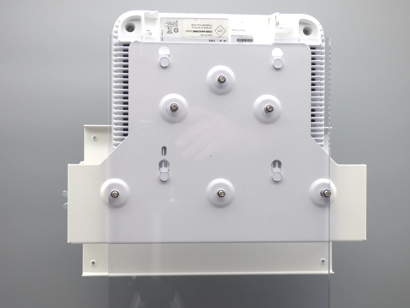 The combined mount for Cisco Access Points and patch antennas enables space-saving installation of Cisco Access Points with external patch antennas on walls or ceilings. The antenna is attached to the front of the mount and – together with the front section – can be tilted approx. ±15° to ±30° up or down depending on the access point in use. This saves space and installation time, as only a single mount is required for both AP and antenna. Material and color match our wall mounts: 1 mm zinc-plated steel, powder-coated, standard color white (RAL 9010); other colors are available upon request.